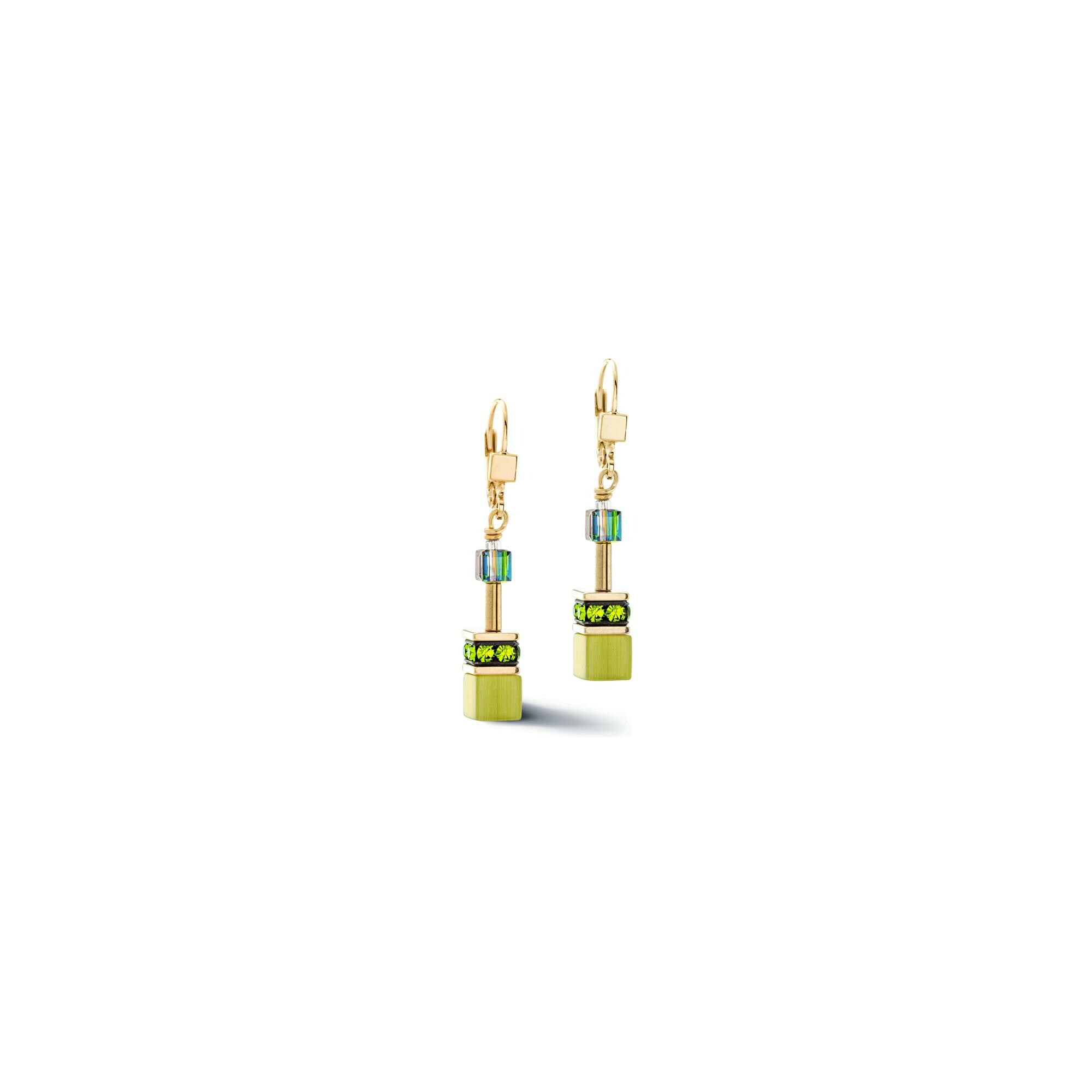 Boucles d'oreilles Coeur de Lion GeoCUBE Iconic Mono en acier doré, cristaux Swarovski, oeil de tigre et strass